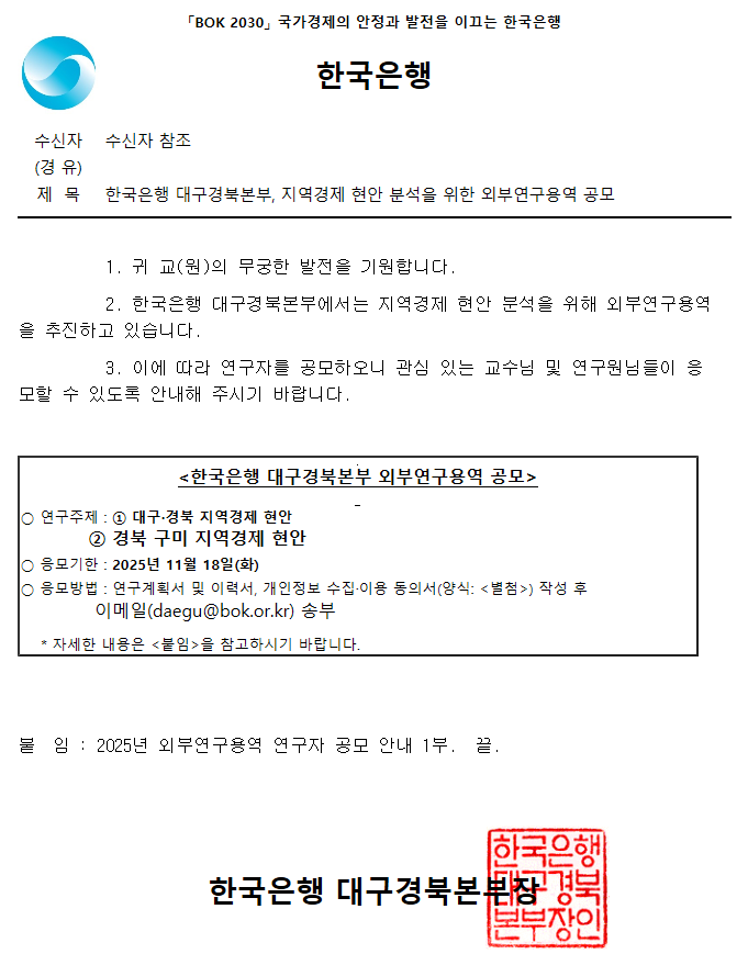 한국은행 대구경북본부, 지역경제 현안 분석을 위한 외부연구용역 공모